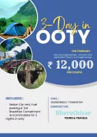 Book you lucrative tour package of Ooty for 2 Nights, 3 Days offered by Bharathiyar Tours & Travels at 12,000 for 2 people . Find detailed day wise itinerary of Ooty tour package below which will be further customized once you enquire with us and share you trip details.