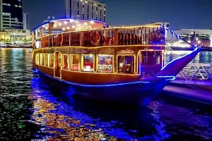 Enjoy a luxurious cruise and dinner on this unique floating restaurant, Explore Dubai's vibrant landscape as you cruise along the Dubai Creek, Relish a scrumptious four-course meal accompanied by the perfect beverages, Savour this exclusive dining experience in the air-conditioned comfort of the restaurant as you enjoy the live entertainment and admire the views.