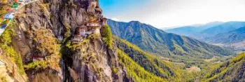 Tiger Nest - From a distance, Bhutan's most iconic building seems to float, weightless, halfway up a sheer cliff-face, 900 meters (3,000 feet) above the floor of the Paro Valley. As you wind your way breathlessly up the long, steep path towards TaktsangLhakhang, the monastery periodically reveals itself, rising out of the forest, closer and more solid with each re-appearance.